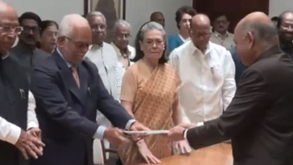 #WATCH | INDIA alliance Vice-Presidential nominee, former Supreme Court Judge B Sudershan Reddy files his nomination in the presence of Congress president-Rajya Sabha LoP Mallikarjun Kharge, Congress Parliamentary Party Chairperson Sonia Gandhi and Lok Sabha LoP Rahul Gandhi.… pic.twitter.com/CbvvmIhg9L